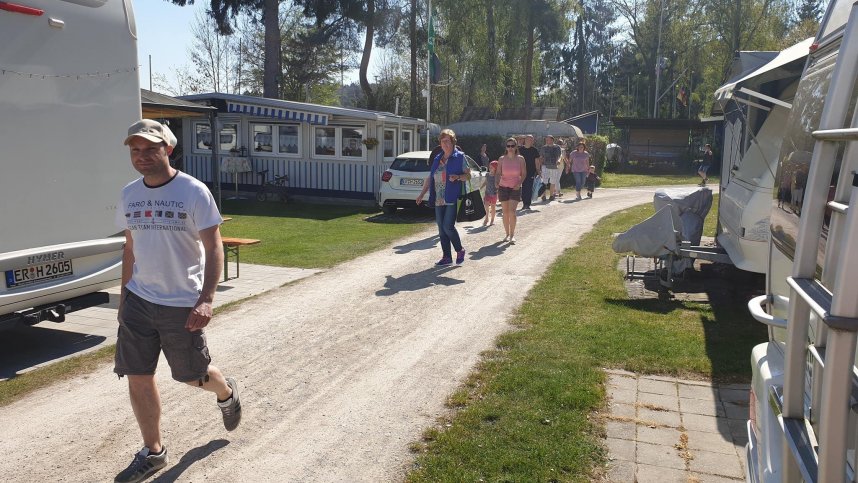 This pleasant site makes a convenient stopover and is quickly and easily reached from either the A3 Würzburg-Nürnberg or the A73 Bamberg-Nürnberg autobahns. It has 110 pitches on flat ground which are mainly for touring units. All are numbered and partly marked but mainly between 50-70 sq.m. so it can look very cramped when busy. There are also 60 permanent units. There is usually space available, but in peak season overnight visitors can often be put on the adjacent football pitch. A large lake, with access from the site through a gate, can be used for sailing or windsurfing and boats are available to hire. There is no fishing at present.