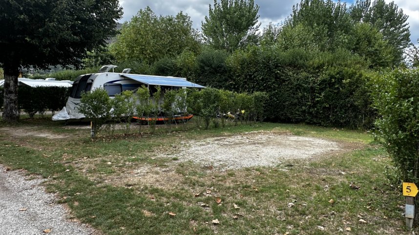This is a much sought-after campsite, and booking is highly recommended; being only 6km from the centre of Annecy, the 90 pitches are taken very quickly, and the site seemed very popular with visitors from the U.K. The road down to the site is really a single track for the last few hundred meters and can become congested, particularly around 2.00 p.m. when check-in opens; I would suggest arriving a little later to avoid this. Check-in was good and efficient, and English was spoken. Once on site, you find well-spaced pitches divided by low hedging, all with tree shade and all easily walkable to the shoreline of Lake Annecy.