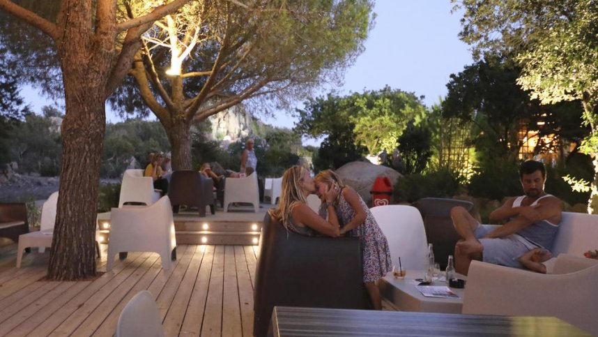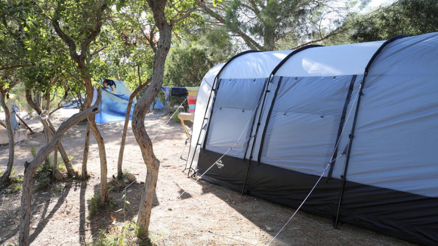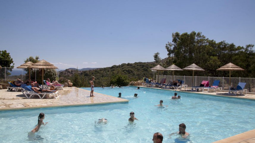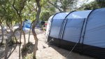 The views from the facilities at this site are stunning, over the rolling hills and coast. ‘The great outdoors’ describes this campsite which is away from any tourist over-development and is at one with nature. The natural and informal pitches sit on the hillside above a superb bay with sheltered water, fine silver sand and safe swimming. Pitches have varied shade from foliage. Large boulders make natural divisions and some pitches need long leads for the 6A electricity. The beach is a 400 m. walk down a rough track through the maquis.