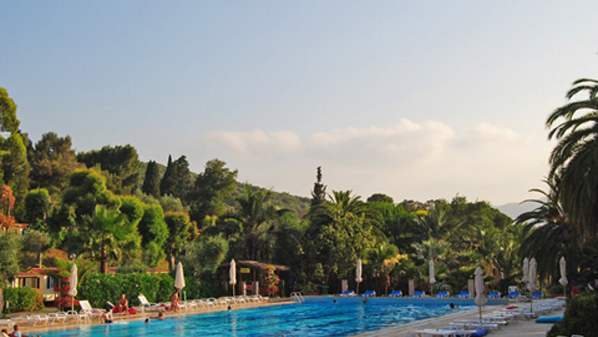 Eight modern, attractive and clean toilet blocks are spread over the site, but the steep terrain may be difficult for those with mobility problems. Laundry with washing machines and ironing facilities. Supermarket, restaurant, pizzeria, pool bar and café/bar (21/4-30/9). Large pool complex with swimming courses and aquarobics (15/5-30/9). Tennis with coaching. Volleyball. Archery. Five-a-side football. Basketball. Trampolines. Bicycle track. Bicycle and motorcycle rental. Secure car park. Botanical gardens. WiFi (charged).