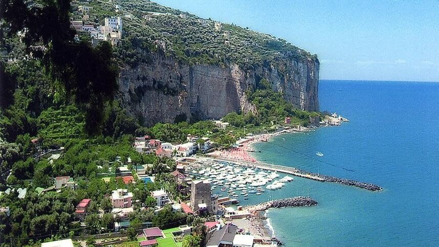 Take route SS145 from Castellamare towards Sorrento. Just 100 m. after tunnel bypass around Vico Equense, just after a right hand bend watch for very hard right turn into a very narrow road for Seiano beach and follow signs.