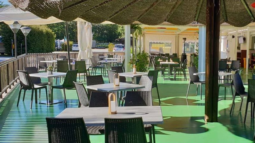 One sanitary block has hot showers (by token, one per day free) and some hot water for laundry. A mixture of British and squat style toilets. One separate accessible facility. Two washing machines and a dryer. Freezer. Motorhome services. Restaurant with terrace also sells basics (bread, milk). Pizzeria. Takeaway. Beach bar. Two play areas. Tennis. Bicycle hire. Beach. Boat launching and watersports. Windsurfer and kite-surfer hire. Fishing. Ambitious entertainment programme. WiFi in some areas (charged).