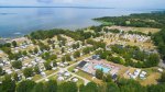 Three heated sanitary blocks provide roomy shower cubicles, washbasins, some washbasin/WC suites and WCs (shower cards required). Accessible Facilities. Well-equipped laundry room. Good kitchen with cookers, microwaves, dishwasher (free), and sinks. Gas supplies. Motorhome services. Shop (May-Aug). Snack bar/takeaway, licensed restaurant and café (Seasonal). Pool bar. Outdoor heated swimming pool (June-Aug, charged). Pontoon with slides. Sauna. Playgrounds. Bouncy cushion. Boules. Football. Minigolf. Family entertainment and activities. Bicycle and pedal car hire. WiFi throughout (charged).
