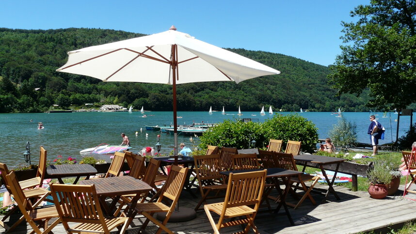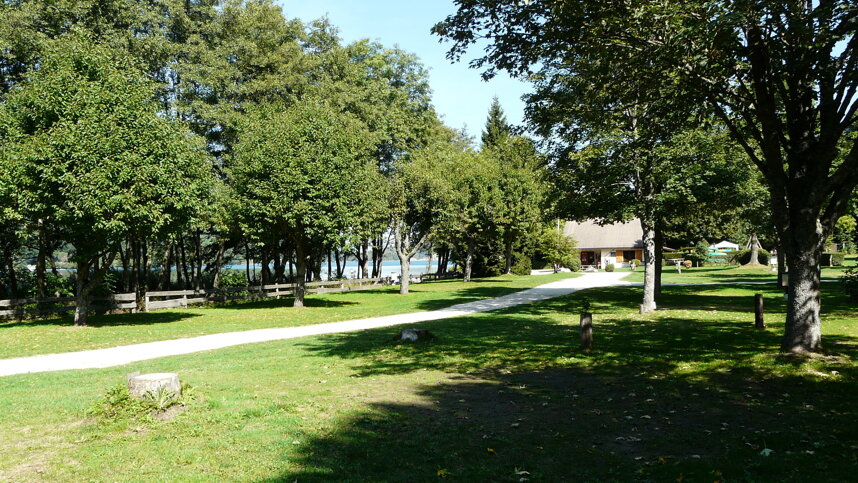 This delightful, small lakeside site will not disappoint. There are 80 touring pitches, all with 10A electricity, and 13 chalets. Set on a level, grass area, all the pitches are of a good size, mostly divided by mature trees that give excellent shade. Some have wonderful lake views. A pleasant lakeside terrace is part of the bar/reception area where breakfast and snacks are served. This is a picturesque site which will appeal especially to water lovers. A sailing school is only 70 m. away.
