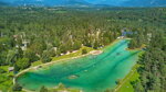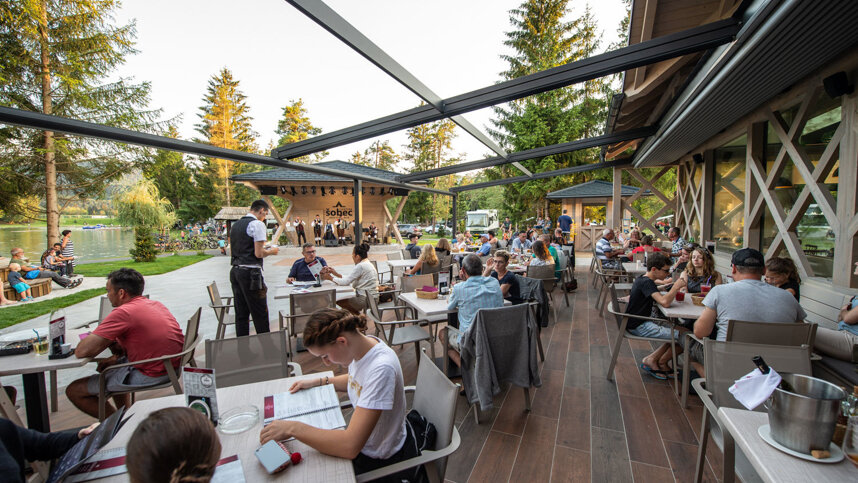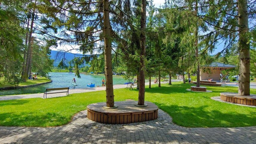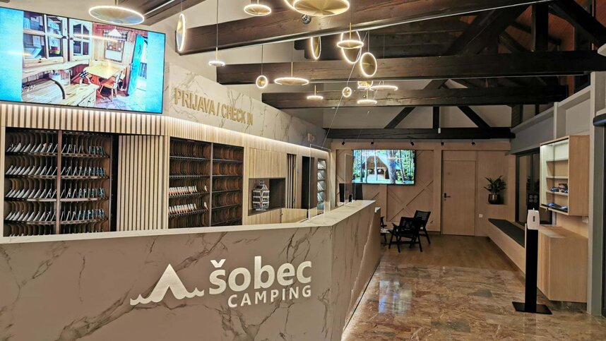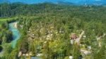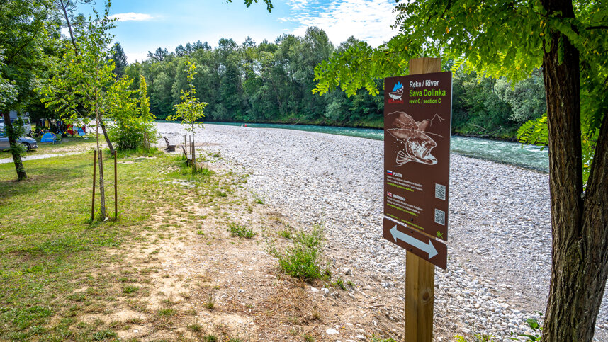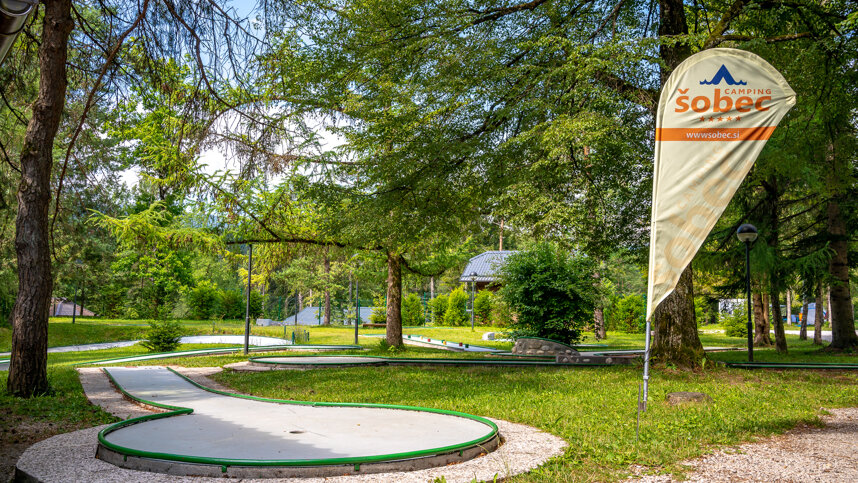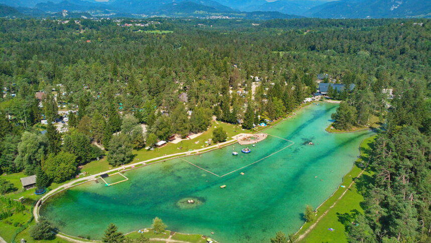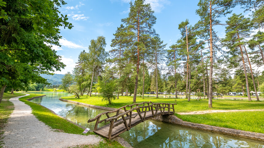 Sobec is situated in a valley between the Julian Alps and the Karavanke Mountains, in a pine grove between the Sava Dolinka river and a small lake. It is only 3 km. from Bled and 20 km. from the Karavanke Tunnel. There are around 500 unmarked pitches on level, grassy fields off tarmac access roads, 457 with 16A electricity and 93 premium pitches. 10 Alpine Bungalows and 1 Deluxe Apartment available for hire. Shade is provided by mature pine trees and younger trees separate some pitches. Camping Sobec is surrounded by water – the Sava river borders it on three sides and on the fourth is a small, artificial lake with grassy fields for sunbathing.