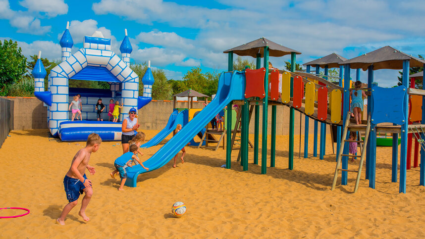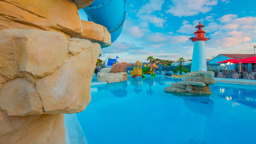 Two clean and well designed toilet blocks include washbasins in cabins and preset showers. Separate accessible toilet and shower room. Washing machines and dryers. Bar and takeaway, heated swimming pool with central water fountain and smaller children’s pool with water slide, covered pool, waterslide and a Jacuzzi (all open all season). Multisports court. Pétanque. Play area. Bicycle hire. Activities and entertainment programme. WiFi on part of site (charged). Only gas barbecues permitted.