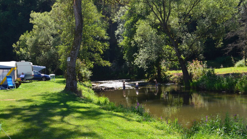 Family run Camping Südeifel is on the western border of Germany, close to Luxembourg. Of the 160 pitches, 60 are for touring, on level, neatly trimmed grass, either on the central field or alongside the small River Prüm. All have access to electricity (6A Europlug), the riverside pitches having a little shade. The River Prüm is lively and shallow, so ideal for supervised play under the shade of the trees. The campsite’s Prümtaler Tavern serves snacks and drinks, and has a verandah looking out over this simple campsite in the pleasant green Eifel countryside. There is no shop, but a takeaway pizza service is offered.