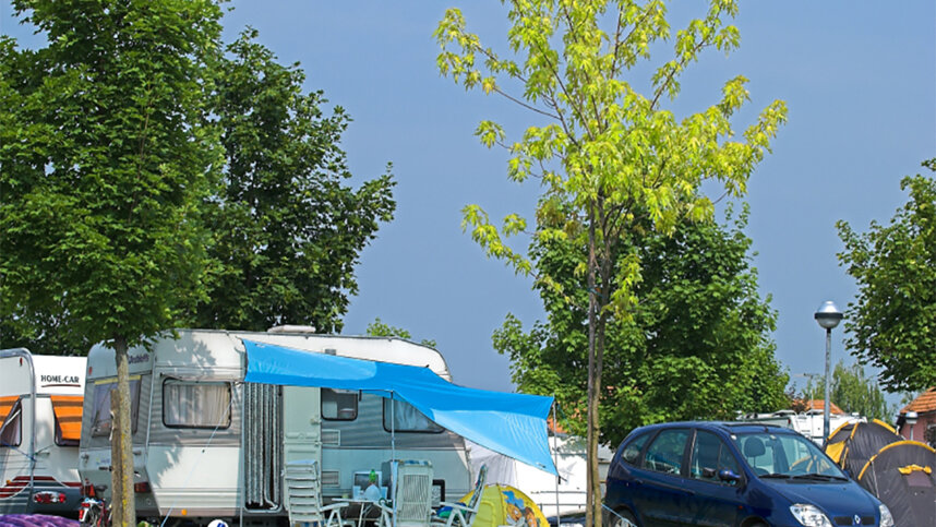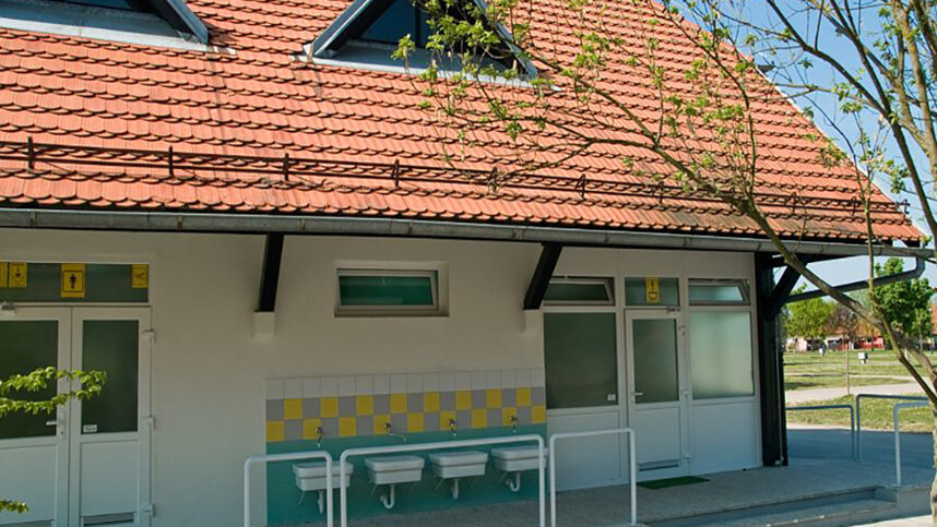 Terme Catez is part of the modern Catez thermal spa, which includes very large and attractive indoor (31°C) and outdoor swimming complexes, among the largest waterparks in Europe, with large slides and waves. The campsite has 700 pitches, with 250 places for tourers, arranged on one large, open field with some young trees – a real sun trap – and provides level, grass pitches numbered by markings on the tarmac access roads. All have 10A electricity connections.