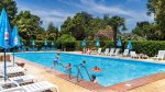 Fully equipped, very smart sanitary facilities include hot water everywhere, private cabins, a baby room and very good accessible facilities. Laundry facilities. Motorhome services. Shop. Bar, restaurant, pizzeria and takeaway. Swimming pool (May-end Sept, hat required) and bar. Carp fishing in river. Play area. Shuttle bus (on payment) to the underground station every 15 or 30 minutes according to season. Torches useful. WiFi on part of site (charged).