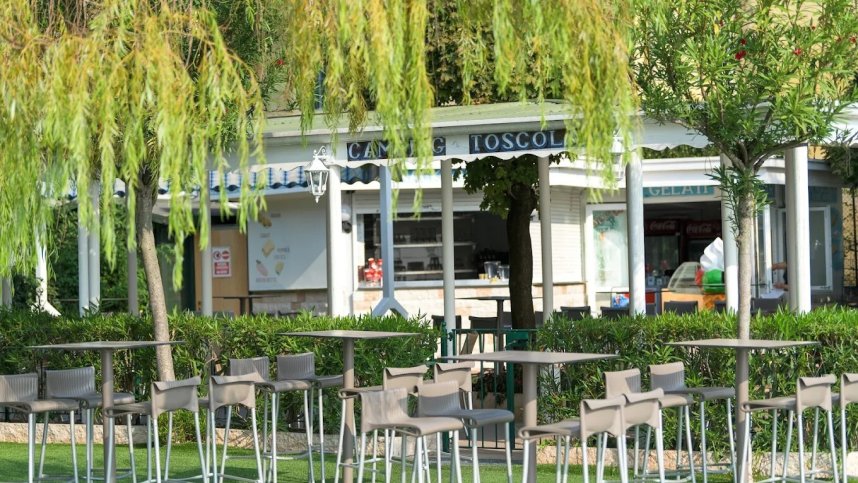The campsite features two outdoor swimming pools, including a main pool for swimming and sunbathing, and a separate paddling pool for children. Both pools are surrounded by sun loungers and umbrellas, providing ample space for sunbathing and relaxation. An on-site restaurant serves Italian cuisine located within the historic building with ancient vaults and features spacious outdoor terraces by the pool, offering beautiful views. A small on-site market is also available for basic necessities and groceries, often including fresh bread and croissants.