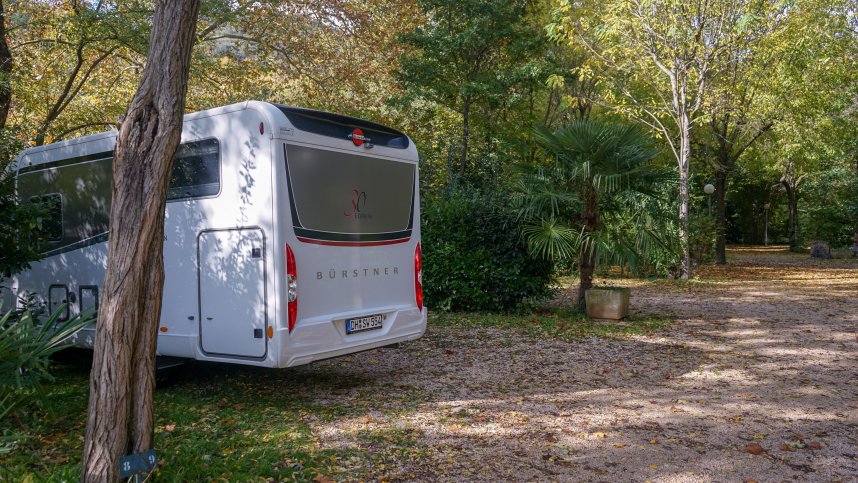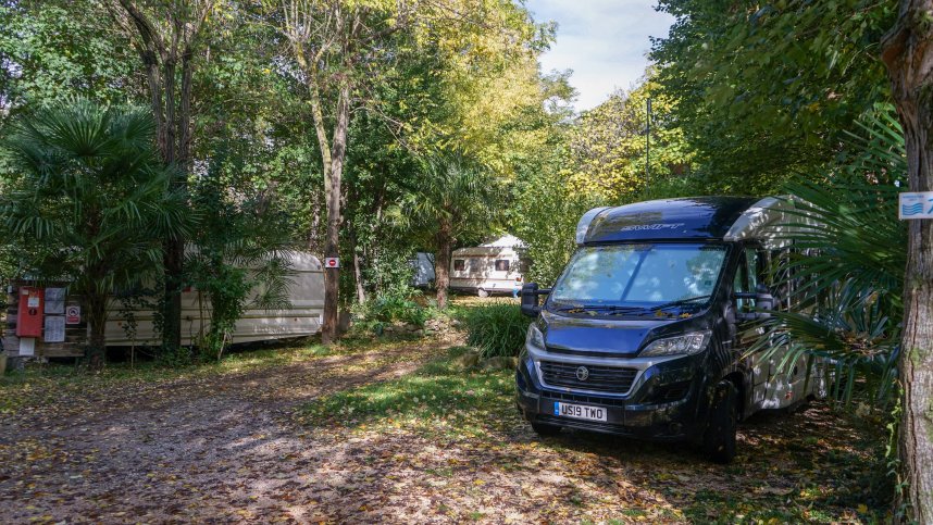 From Carcassonne take D118 south for 32 km. Ignore first sign to Alet (to avoid narrow stone bridge) and after crossing the river, turn into town. Site is 800 m. on the left (tight burn, but signed).