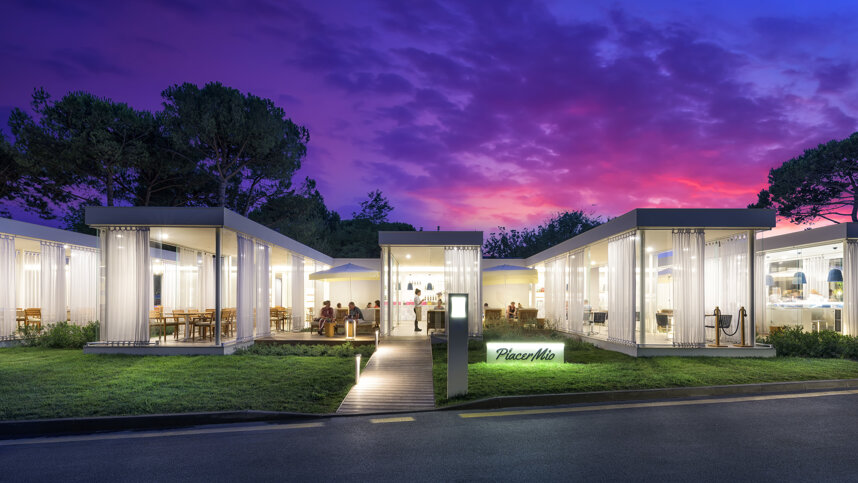 The 15,000 sq.m. wide, multi-level AquaMarina Park has exceptional facilities - a feature pool for children with slides and a huge cascade complex, an Olympic size pool with massage jets, a lagoon with disability access, and a wave pool with a beach. There are charming features for the youngest campers, a choice of whirlpool and a solarium on grass, plus an impressive 45-metre panoramic bridge. After all of this, enjoy a little relaxation on one of the reclining chairs and a refreshing drink from the bar. The restaurant, entertainment area and shopping ‘mall’ are well planned. This is a very efficiently run site with committed management and staff.