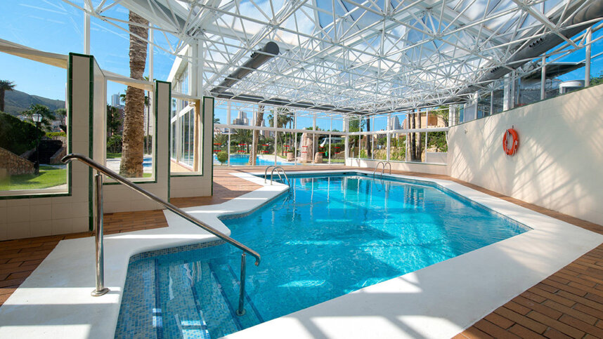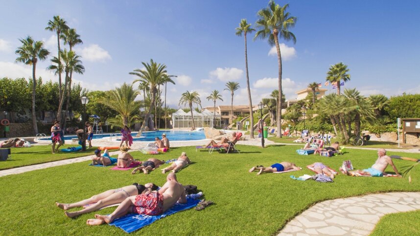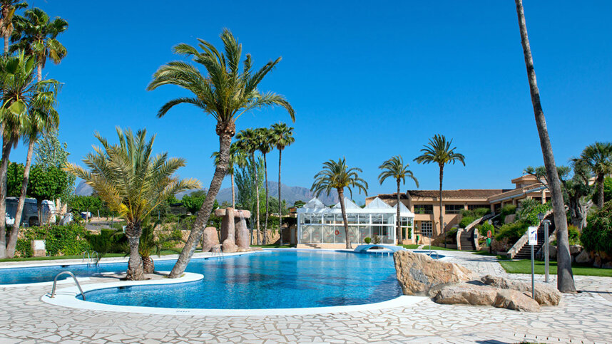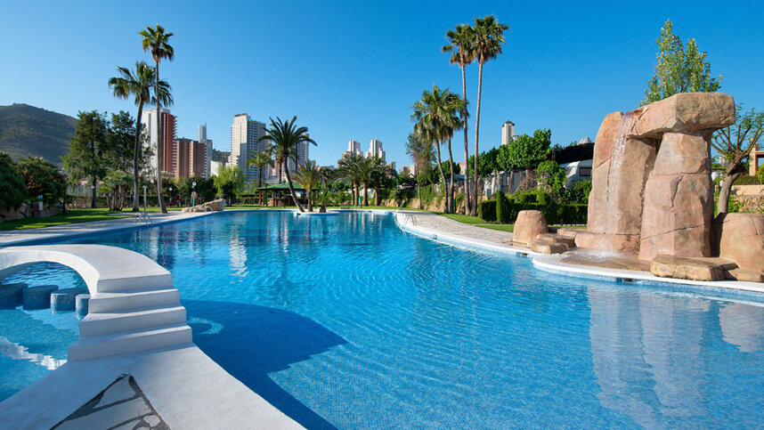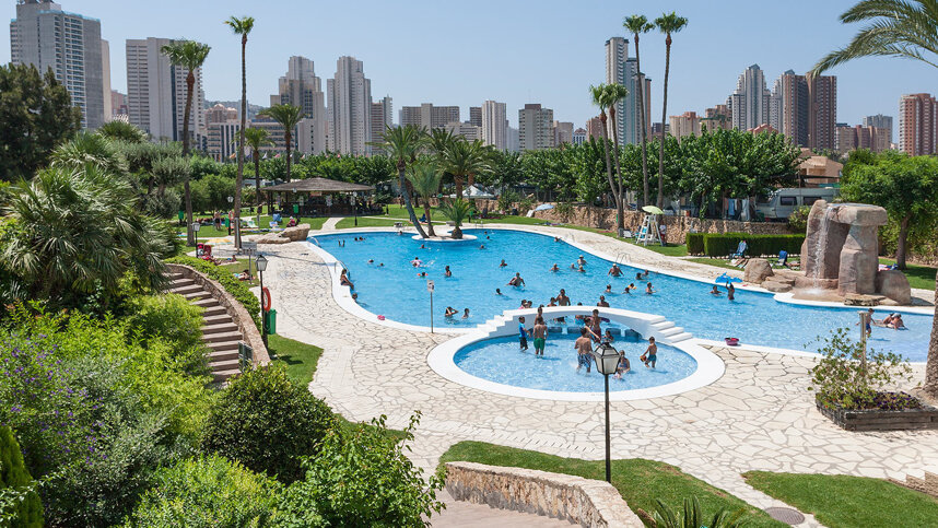This complex features a lovely, sheltered free-form pool in a beautifully landscaped, grassy sunbathing area where palm trees and Mediterranean shrubs and flowers create a colourful and exotic atmosphere. The town and Levante beach are within easy walking distance (1.3 km) allowing you to leave your car on site. If you are looking for first class amenities in Benidorm, in pleasant and fairly quiet surroundings, this site would make an excellent choice.