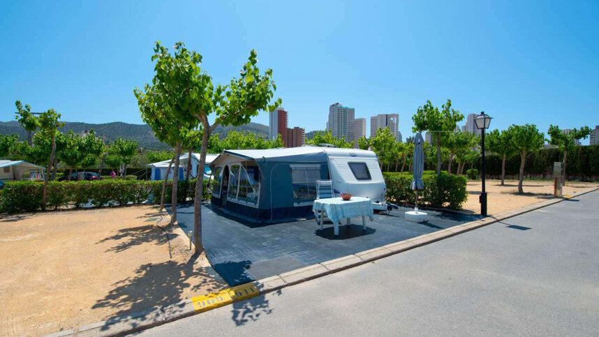 Benidorm is increasingly popular for winter stays and Villasol is a genuinely good, purpose built modern site. Many of the 448 well separated pitches are arranged on wide terraces which afford views of the mountains surrounding Benidorm. All pitches (80-85 sq.m) have electricity and satellite TV connections, with 163 with full services for seasonal use. Shade is mainly artificial. Reservations are only accepted for winter stays of over three months (from 1 October). There is a small indoor pool, heated for winter use, and a very attractive, large outdoor pool complex (summer only) overlooked by the bar/restaurant and attractive, elevated restaurant terrace.