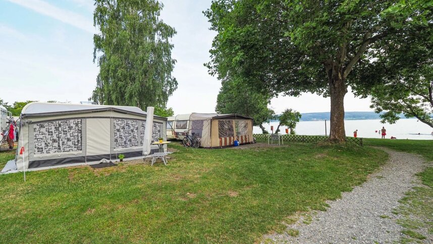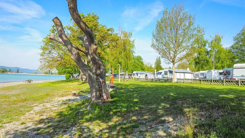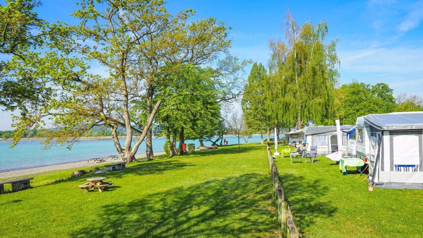 Camping William is a well organised and well-maintained site William located directly on Lake Constance. An ideal destination for water sports enthusiasts, anglers and guests with their own boat. Cyclist can clock up a few km on the famous Lake Constance Cycle Route, which runs around the lake. Some of the 130 touring pitches with 16amp electric hook-up point are located on the water's edge. Different rates apply for these pitches. A railway line runs along the other site of the site. There are a large number of seasonal pitches. This site is extremely suitable for water sports enthusiasts and keen anglers.