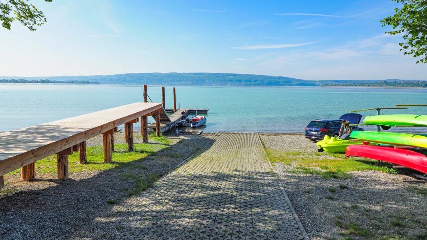 There is a generous boat storage facility and a boat slip way for guests with their own boat. You can also hire canoes, kayaks and motorboats. The Untersee lake is suitable for windsurfing, water skiing, sailing and snorkelling. You can also go for a swim in the lake. The lake slopes down gently, making it ideal for the little ones to paddle. Sunbathing lawns and beach showers are also available.
