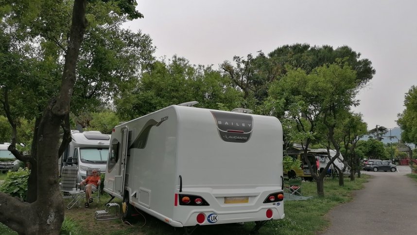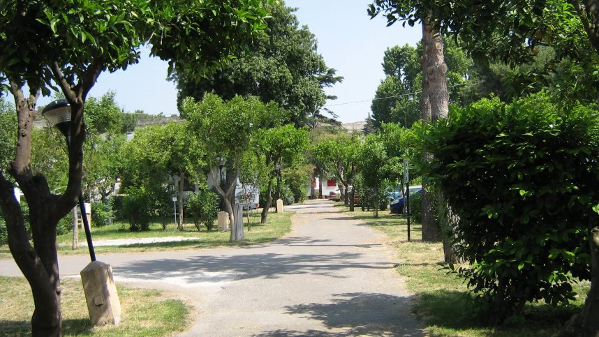 The naming of this site is obvious once you discover it is just 50 metres from the entrance to the fantastic ruins at Pompeii (closer than the car park). It is a reasonably priced, city-type site perfect for visiting the famous Roman archaeological sites here. The site’s 100 pitches, all for touring units, are on flat grass under mature trees that give shade. All have access to 10A electricity. Larger units use the tarmac parking area. Access amongst the Orange trees can be a challenge even with a motor mover. This site provides a safe central location and is of a high standard for the area, albeit with none of the holidaying trimmings.