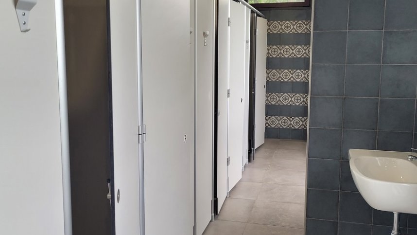 The single sanitary block is modern and on two stories. Toilets, Accessible facilities baby and washing machine are on the ground floor. Showers are on the on 2nd floor upstairs. British style WCs. Showers have hot and cold as do wash hand basins. Washing machines. Gas supplies. Reception also serves the Hotel, so can get very busy. Bar/restaurant at site entrance with good value daily menu at lunch times (evenings only until 18:00) with waiter service. WiFi (charged). Accommodation to rent. E.V. charging stations. Pets allowed.