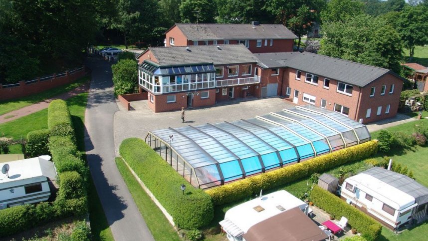 The heated toilet block has showers (charged), washbasins and wc’s. Chemical toilet point. Dishwashing area. Laundry with washing machine and dryer. Restaurant. Bar. Snack bar. TV room. Billiard café. Billiard, snooker and pool tables. Bread to order. Indoor heated swimming pool. Plenty of walking routes and opportunities for cycling in the area. Tourist information in Tecklenburg. Wi-Fi. BBQ’s allowed. Children’s play area. Table tennis.