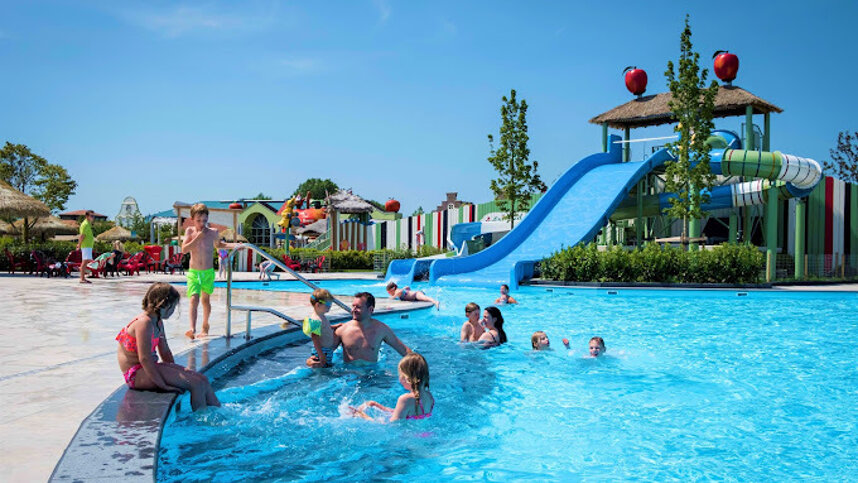 Modern toilet block with preset, hot showers (free), washbasins (open and in cabins) and toilets. Toilets and washbasins for children. Fully equipped baby room. Accessible facilities, Laundry with washing machines and dryers. Shop, restaurants and bar (April-Sept). Swimming and paddling pools. Water slides, Indoor play hall and several outdoor play areas. Mini golf, Pump track, Playing field. Tennis. Boules. Bicycle hire. Fishing. Entertainment programme. Internet and WiFi over site (charged).