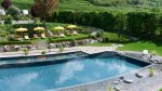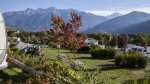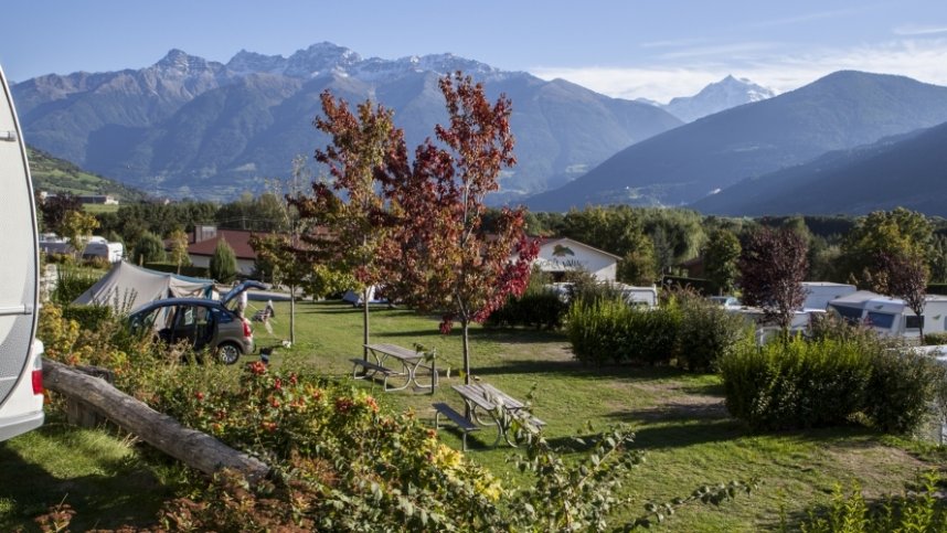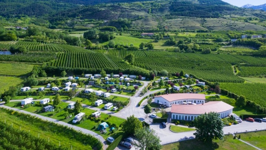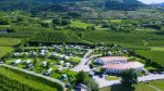 Gloria Vallis is a style setter. The 92 terraced pitches are well grassed, level and all have 8A electricity, water and drainage. All have lovely mountain views and young trees provide some shade. The whole site is most attractive with flowers and landscaping. There is an elegant curved restaurant and bar with a spectacular panorama across the valley with its thousands of apple trees and snow capped mountains beyond. Another more casual eating area is across a grass field alongside a small lake which is stocked with fish. A very modern building houses the excellent sanitary facilities and a sympathetically designed, outdoor swimming pool.