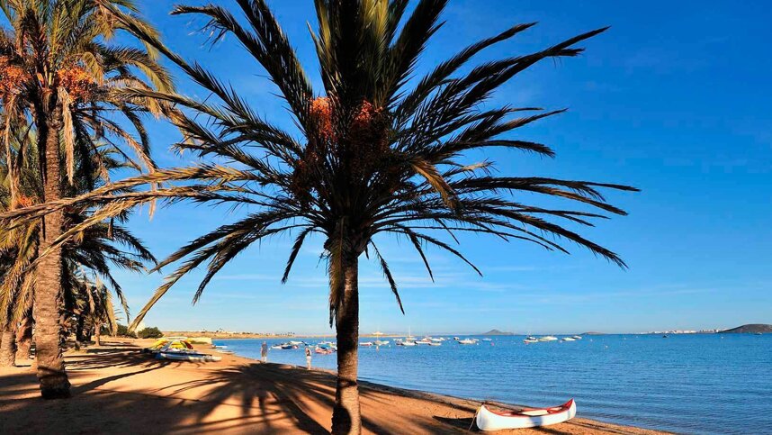 If you are suffering from aches and pains try the famous local mud treatment. Reception will assist with bookings. La Manga is a 22 km. long, narrow strip of land, bordered by the Mediterranean on one side and by the Mar Menor on the other with sandy bathing beaches on both sides. The very end of the southern part is great for ‘getting away from it all’ (take a picnic for the beach and be sure to go over the little bridge for privacy). The campsite is situated on the approach to ‘the strip’, enjoying the benefit of its own semi-private beach with impressive tall palm trees alongside the Mar Menor, which provides shallow warm waters, ideal for families with children. Here you will find a sailing, canoeing and windsurfing school, and an excellent restaurant/bar serving traditional Spanish tapas and meals. In winter, when British occupancy exceeds 60 per cent, typical British meals are available including Sunday roast and full breakfasts.