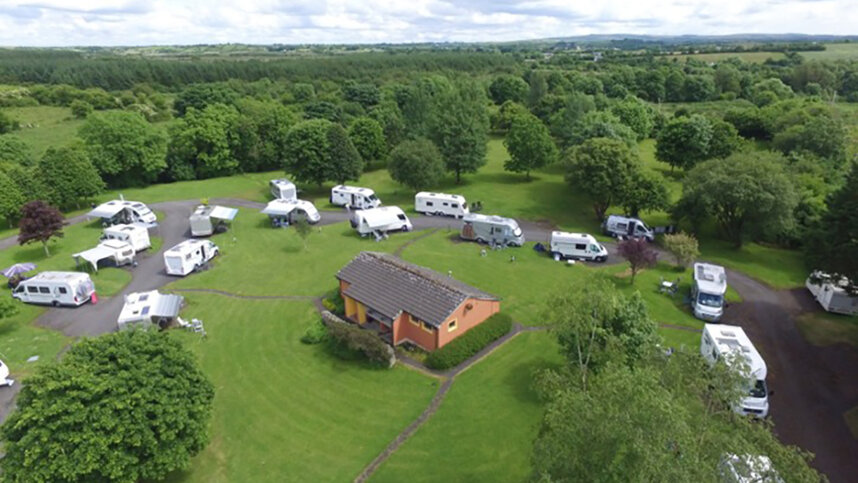 What appeals most about this campsite is its quiet, ‘heart of the countryside’ location and well-kept appearance. Attractively laid out amidst undulating grass areas, trees and shrubs are 28 touring pitches on hardstanding (16A electricity) and a designated area for 30 tents. Adjacent to the camping area stand several buildings which are gradually being refurbished. These house reception, shop, a clubhouse serving meals and takeaway food, also a campers’ kitchen and games room. For children, there is a play area, and for fishers, the Clydagh River borders this 3.5-acre site.