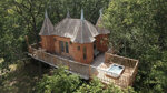 This is a unique site and a good example of luxury glamping. There are three wooden castles (2-6 persons) constructed among the tree tops. Each château has been assembled from locally sourced timber and is equipped with TV, WiFi, tea and coffee making facilities, minibar and a terrace with hot tub. Rental packages include linen and towels, and breakfast is served from 09.00-10.00. Each unit is fully insulated, with heating and air conditioning. Children are welcome and security features are installed to ensure their safety. Sitting out among the trees, surrounded by greenery and serenaded by birdsong is an unusual feature. Please note – there are no touring pitches here.