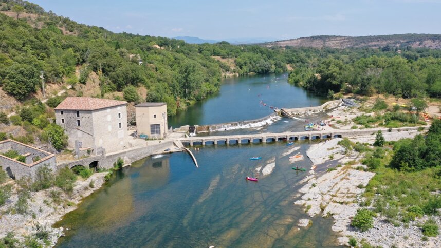 On the D579, some 2 km. from Vallon towards Ruoms, at ‘LIDL’ roundabout, turn south onto minor road towards village of Les Mazes and site. Travel through the village, noting the signs, 1.5 km.