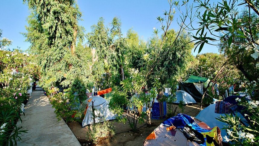 Ferries arrive at the main port of Livadi. From there, head south through Ramos to Livadakia Beach and the campsite is well signed.
