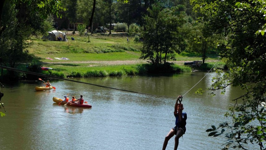 New toilet blocks (one heated in low season) have modern facilities, including those for babies and accessible facilities. Launderette. Motorhome services. ‘Salle de Vie’ housing shop and bar (1/6-30/9), snack bar and restaurant (15/6-12/9), TV and Internet point. Heated outdoor swimming pool and paddling pool (1/6-26/9). Indoor pool with water jets and counter-current (8/4-26/9). Play area. Bicycle and canoe hire. Fishing. Free WiFi over site. Tree houses, chalets, equipped tents, Romany-style caravan and luxury cottage to rent. Max. 1 dog.