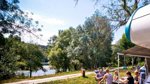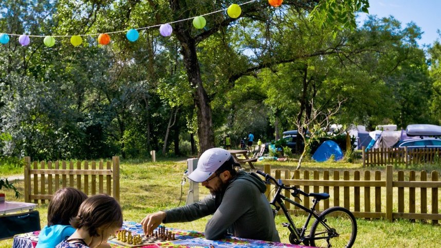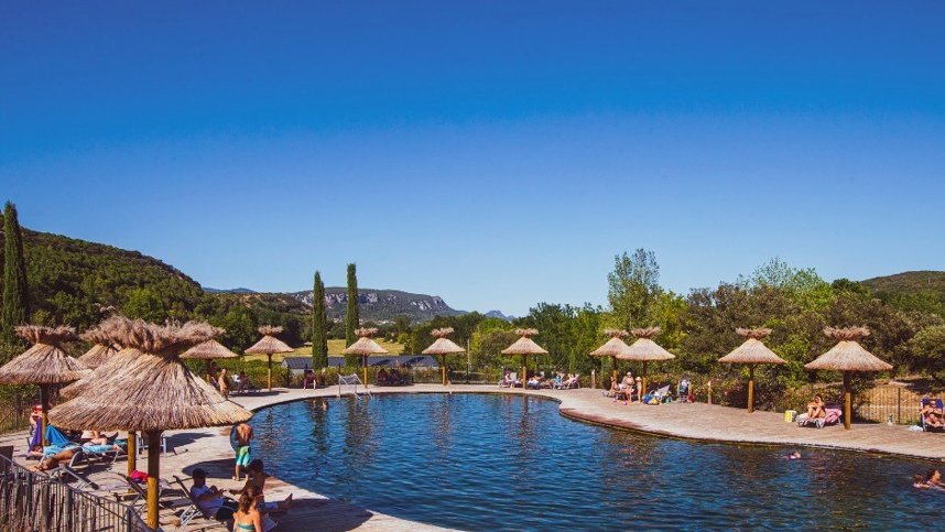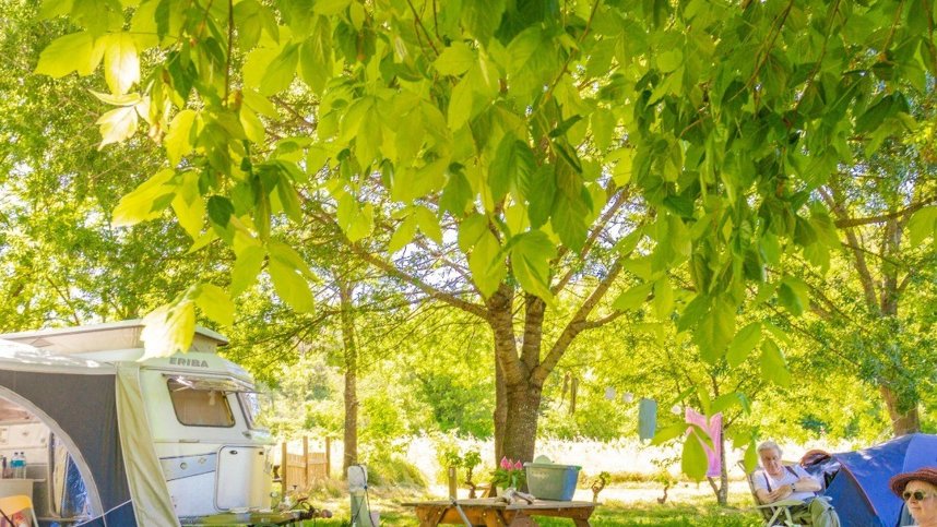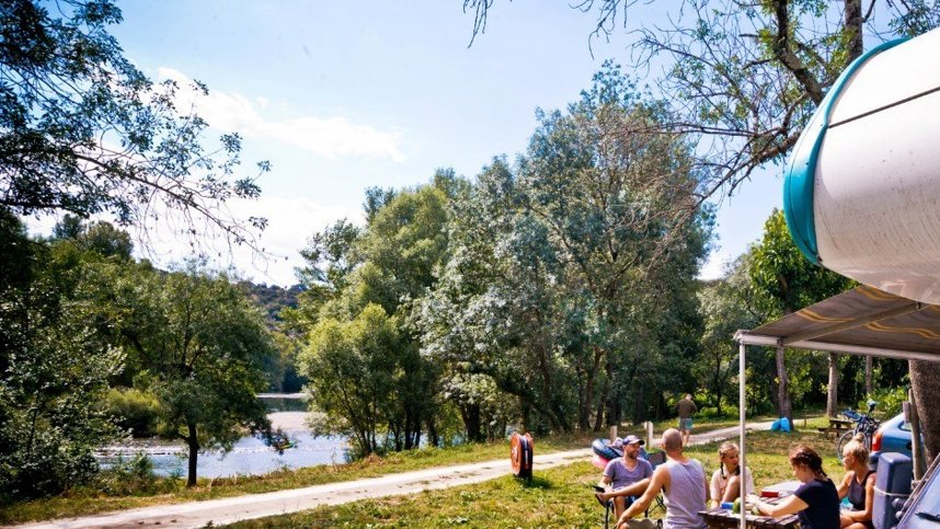 The river is wide here and it is possible to swim and canoe. Carole and Roger Gaussargues, who have developed the site, also own the vineyard down the road and are very proud of their achievements. Reception has been traditionally built of local stone and provides a small shop, local wine etc. In high season and at some weekends, simple meals, pizzas and salads can be enjoyed al fresco. It can be very hot so the river is welcome to help cool off. Messing about in the river will keep children occupied for hours but there is a large playing field and a communal barbecue for those who have tried their hand at fishing. There are some log cabins to rent which fit well in the environment.