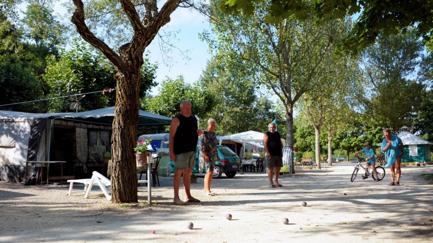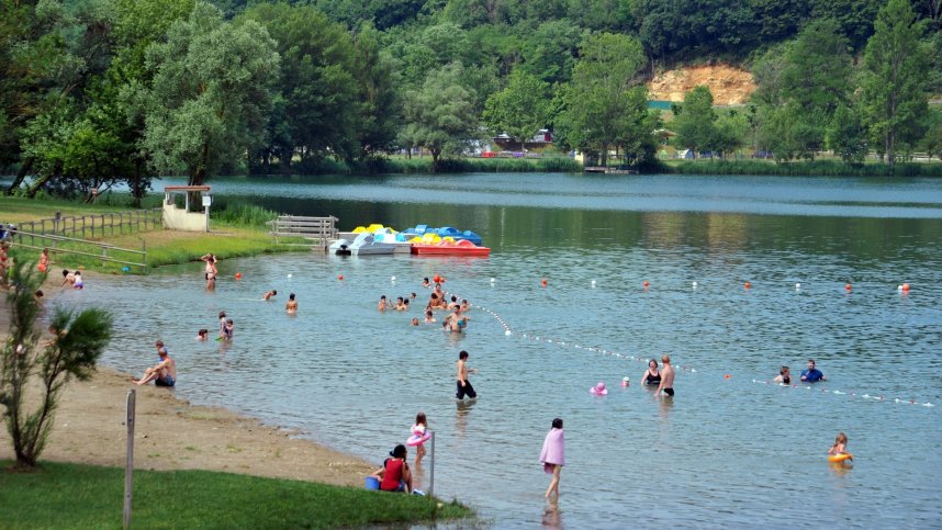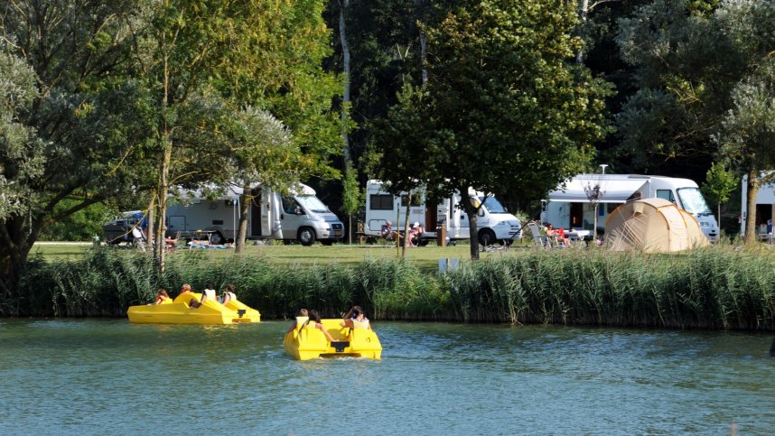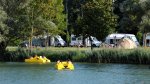 Lac de Champos is a spacious park surrounding a nine-hectare lake. There are large grassy areas for recreation with fishing, bathing and boating (no motors) on the lake, all open to both the public and to campers. The public area of the park is at one end near entrance and the campsite at the other. There are 98 pitches close to the lake with 60 for touring units, some stony and some grassy. Most have some shade and 6/10A electricity (long leads advised). A separate sunny, level, tarmac area adjacent to a grassy public picnic area and overlooking the lake is available for motorhomes.