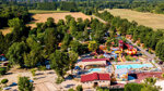 Situated in a ten-hectare wooded park some 24 km. from Lyon, and bordering the Ain and Rhône rivers, Domaine la Regière occupies a unique position between the city and the countryside. It is ideally placed for discovering the cultural and tourist sites of the Isère. There are 189 chalets, with 35 pitches for touring set on two unmarked areas without shade. Around a third have access to 8A electricity. There is plenty to do on this family-friendly site - a water park with outdoor pools, plus a covered heated pool, lagoon pool and Jacuzzi which are open all year. The surrounding countryside is ideal for hiking and nature activities.