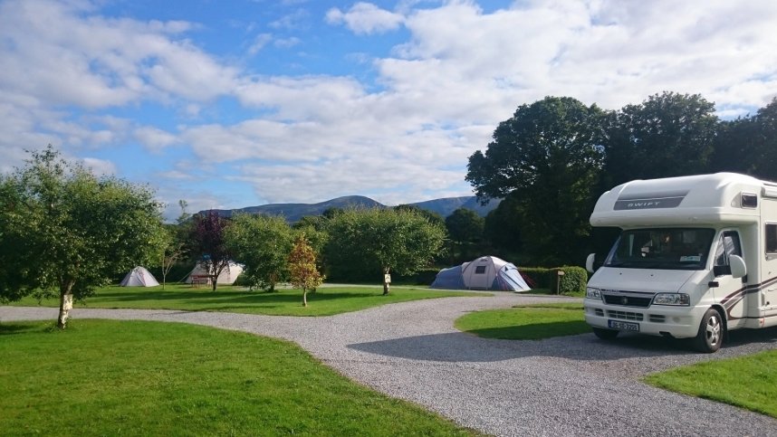 This is a very pleasing, small touring park, surrounded by green fields, yet only five minutes away from Killarney town. There are many trees and shrubs around the park, but dominant is a magnificent view of the MacGillicuddy’s Reeks. There are 30 pitches for caravans and tents, 30 with hardstanding and a grass area for awnings, electricity (10A Europlug), water points and night lighting. One pitch is designated with a specially adapted en-suite facility. Unusually, old school desks are placed in pairs around the site as picnic tables, plus an antique green telephone box. One can enjoy walking through the oak wood, fishing on the Flesk or visiting the site’s own National Farm Museum.