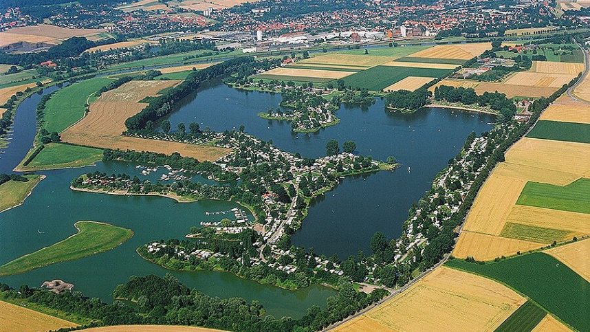 Erholungsgebiet Doktor-See is a large site near the town of Rinteln, on the Weser River around the Doktorsee lake. This hilly landscape with alternating agricultural and natural areas, many small towns and villages with picturesque half-timbered houses, has a friendly atmosphere. The first impression of the site is overwhelming. This is because of the enormous proportions of the grounds. The grounds are well kept, and the 1400 pitches are average in size and mostly located around the edge of the lake. Around the lake are a number of holiday cottages and mobile homes. There is also a marina, a motorboat club and a church.