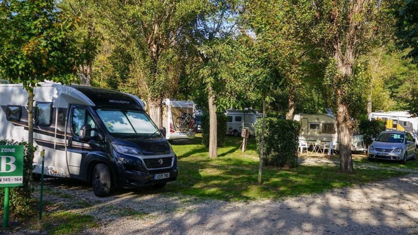 There is reasonable space allocated to touring units with many of these pitches in area C of average/small size so check your allocated pitch. Some pitches in area B are larger, and have water and electricity. Many large groups use the site so booking is recommended. There are about 130 well-equipped bungalows attractively arranged in a village-style setting on the slopes. BBQs are not allowed on pitches.