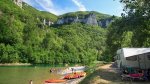 Although shady, this well managed site has an open feel with a long stony beach frontage to the river Tarn, one of the best in the area. All the 137 touring pitches (100-150 sq.m) are level and have 10A electricity. There are also 53 mobile homes to rent. Extensive refurbishment of the site’s facilities has taken place over the last two years, with a new attractive reception, restaurant and bar area together with a large swimming pool complex. The site is ideally placed for visiting the Tarn, Jonte and Dourbie gorges, and having its own canoes, round trips of 5 and 17 km. are organised daily.