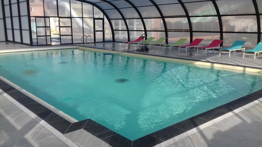 Three clean and well positioned toilet blocks have mostly British style WCs and washbasins in cubicles. Baby bath. Accessible facilities, Laundry facilities. Car wash. Well stocked shop in high season, bread available from bar at other times. Bar (1 Apr - 30 Sept) with reasonably priced takeaway service. Heated swimming pool (15x10 m), waterslides and paddling pool (1 May - 31 Aug). Simple play area. Kids' club (Mon-Fri in Jul/Aug). Tennis. Sports court. Boules. Fridge hire. Charcoal barbecues are not permitted. WiFi (charged). There is also a nice restaurant/bar offering pizza and brasserie meals from April to September. The terrace here also becomes the centrepoint for live shows and entertainment in high season.