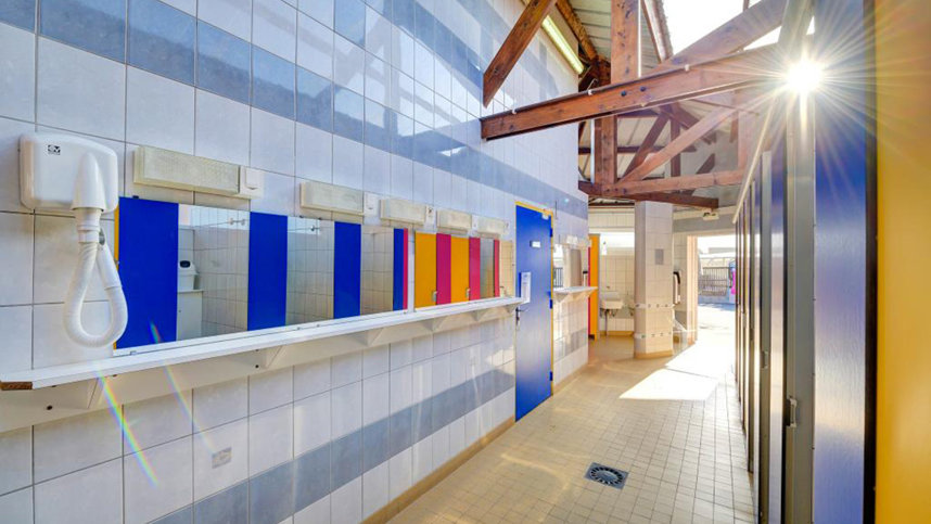 One well equipped and clean sanitary block provides British style toilets, washbasins in cabins and showers. Baby bath. Accessible Facilities. Laundry facilities. Motorhome services. Shop. Bar, restaurant and takeaway. Swimming pool (Seasonal). Multisports court. BMX area. Play area (unfenced). Volleyball. Tennis. Games room. Aviary. Free WiFi over site. Entertainment in high season. Mobiles homes to rent.