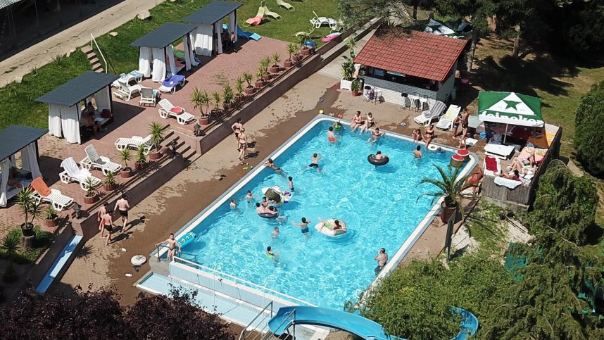 This good site lies at the foot of a hill with views of the vineyards, but Budapest is only 25 minutes away by bus. Concrete and gravel access roads lead to terraces where there are 170 individual pitches most bordered with hedges, all with electricity (up to 16A, long leads needed) and 14 with water, on slightly sloping ground. The site is surrounded by mature trees and Mr Szücs, the owner, will proudly name the 150 varieties of bushes and shrubs that edge the pitches. An open-air swimming pool with flume will help you to cool off in summer with an indoor pool for cooler weather.