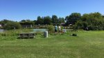 Two modern toilet blocks, one at each end of the touring field, have all the usual facilities and were fairly clean when we visited. Accessible facilities for visitors include a designated pitch and sanitary unit. Laundry. Motorhome services. Bar. Three outdoor heating swimming pools with maxi-flume. All-weather tennis court. Fishing – licence required. Football. Large area for ball games. Adventure-style play centre. Barbecue and picnic area. Max. 1 dog in peak periods. Free WiFi in bar.