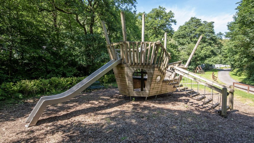 Two good adventure play areas have wooden equipment and safe bark surfaces (one near a fast flowing stream which is fenced). There is a well stocked shop and a restaurant/coffee shop serving breakfast and light lunches. Essentially this is a park for those seeking good quality facilities in very attractive, natural surroundings, without too many man-made distractions – apart from some traffic noise during the daytime. It provides a relaxed setting with woodland walks direct from the park.