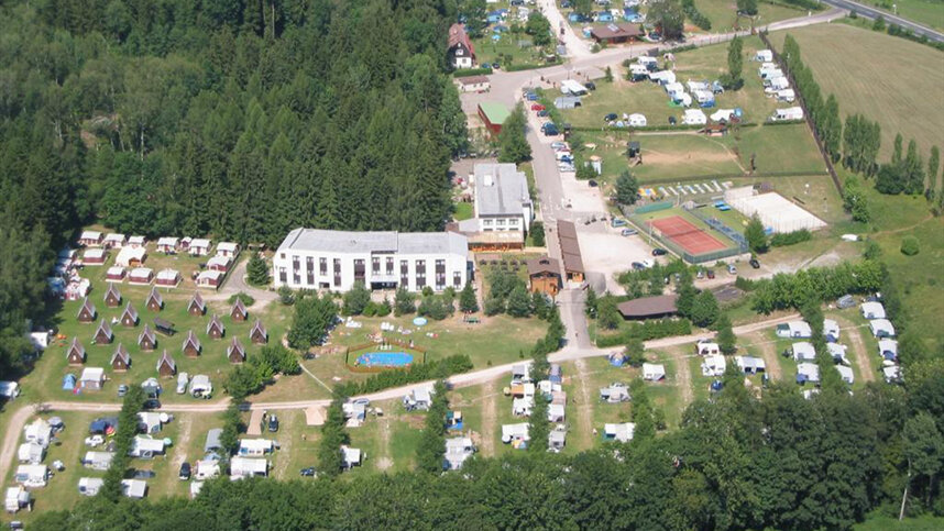 Two dated but serviceable sanitary blocks near the entrance and another block next to the hotel include toilets, washbasins and spacious, controllable showers (on payment). Child size toilets and baby room. Accessible facilities. Sauna and massage. Launderette with sinks, hot water and a washing machine. Shop (15/6-15/9). Bar/snack bar with pool table. Games room. Swimming pool (6x12 m). Adventure-style playground on grass with climbing wall. Trampolines. Tennis. Minigolf. Archery. Russian bowling. Paragliding. Rock climbing. Bicycle hire. Entertainment programme. Excursions to Prague.