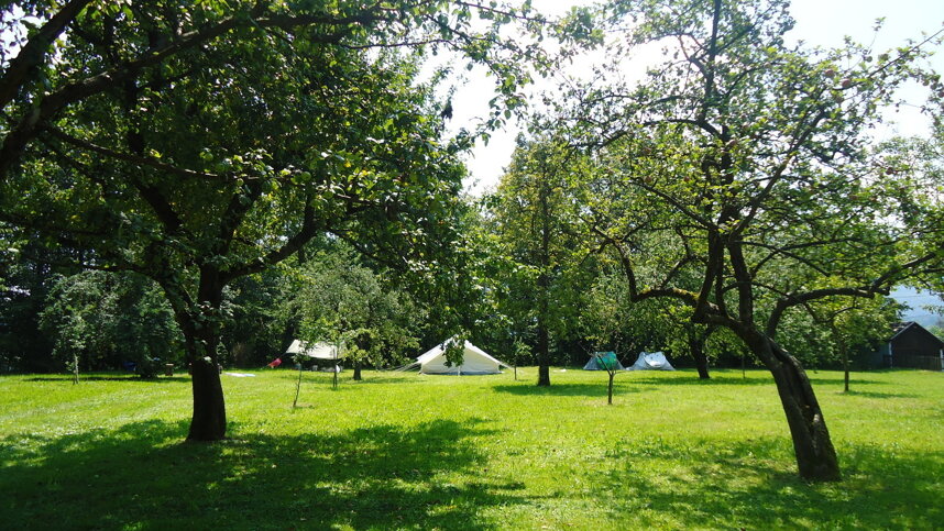 This is a very small, quiet, peaceful campsite of only 20 level, grassy pitches, 16 with electricity (16A), laid out in a farmyard orchard. It is near the small village of Brezje which is situated in the Alpine area of north-west Slovenia, not far from the Austrian and Italian borders and only 30 minutes’ drive from the large town of Ljubljana. Brezje has a large Basilica, which is a major centre for pilgrimage and there is a hop-on tourist bus, in July and August, that tours the area and visits Lake Bled. The site entrance is not suitable for larger units.