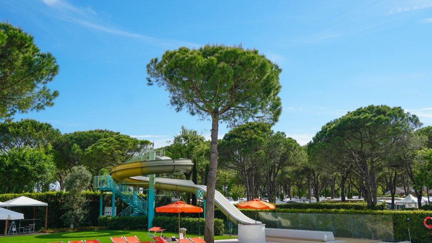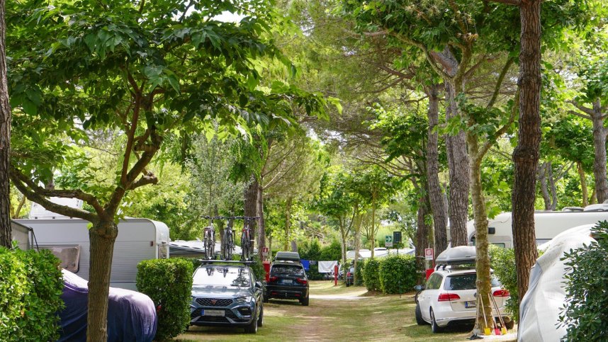 Italy Camping Village, under the same ownership as the better known Union Lido which it adjoins, is suggested for those who prefer a smaller, more compact site. The 180 touring pitches are on either side of sand tracks, off hard access roads, under a cover of trees. All have electricity connections (10A Europlug) and 126 are fully serviced. Pitches are between 60-80 sq.m. but access is impossible for large units, particularly in high season when cars are parked everywhere. A pleasant heated swimming pool (with lifeguard) has two slides, one is very long. There is direct access to a gently sloping, sandy beach.
