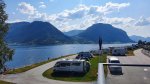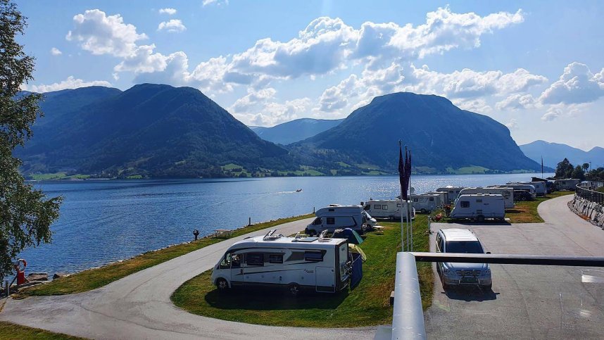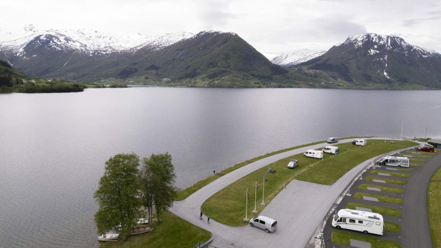 Jølster Panorama is an idyllic and modern campsite situated on the edge of Jølstravatnet lake in Skei i Jølster, Norway. Located approximately 1.5 km from Skei Servicenter, it serves as an excellent base for exploring the stunning surrounding area and engaging in various activities on offer in the Jølster region. The campsite offers 70 pitches of which 40 are for touring and have electric and water hook up points available. Most pitches have uninterrupted panoramic views of the lake and the mountains. The lake itself is renowned for trout fishing, allowing guests to fish directly from the campsite.