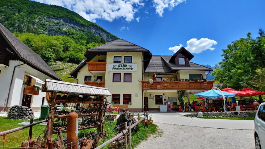 Kamp Klin is privately owned and there is a ‘pension’ next door, all run by the Zorc family, who serve local dishes with compe (potatoes), cottage cheese, grilled trout and local salami in the restaurant. From the site, one can drive to a parking place and explore the Triglav mountain and its beautiful viewpoint with marked walking routes. Like so many Slovenian sites in this area, this is a good holiday base for the active camper.