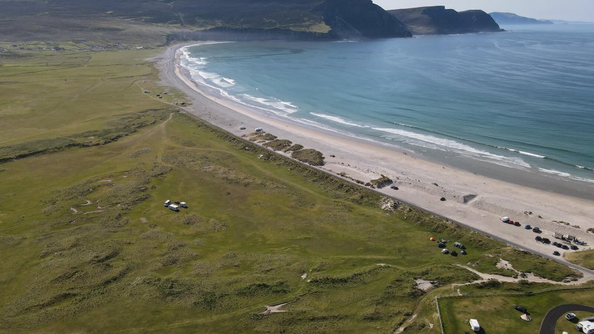 This park offers a taste of island life and the opportunity to relax in dramatic, scenic surroundings. Achill, Ireland’s largest island, is 24 km. long and 19 km. wide and is connected to the mainland by a bridge. The wide-open site is situated beside the Blue Flag beach near Keel Village. Although static holiday mobile homes are on this site, the 84 touring pitches are kept separate. There are 50 pitches with hardstanding, and some are located at the perimeter fence overlooking the beach. Although sand-based, the ground is firm and level. Roads are tarmac, and there is direct access to the beach, which lifeguards supervise.