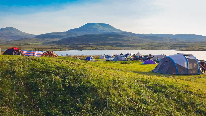 Kinloch Campsite is in an amazing setting on the shores of Loch Dunvegan. Located in the northwest of the Isle of Skye, it is the only site on Skye with both a stunning waterfront location and easy access to all the services of a traditional Highland village. The site is on a former croft at the head of scenic Loch Dunvegan and is overlooked by MacLeod’s Tables, two distinctive flat-topped hills that dominate the skyline. There are pitches right on the loch shore giving visitors amazing views and making it the perfect spot from which to watch the many and varied birds that populate these tidal waters, including the occasional eagle. Seals are also regular visitors. Dunvegan is the ideal base to explore the north of Skye and is a popular diversion on the North Coast 500. The site has 120 grass or hard standing pitches most with electric hook-up 16amp. There are large tent areas where owners can choose their spot to pitch their tents.